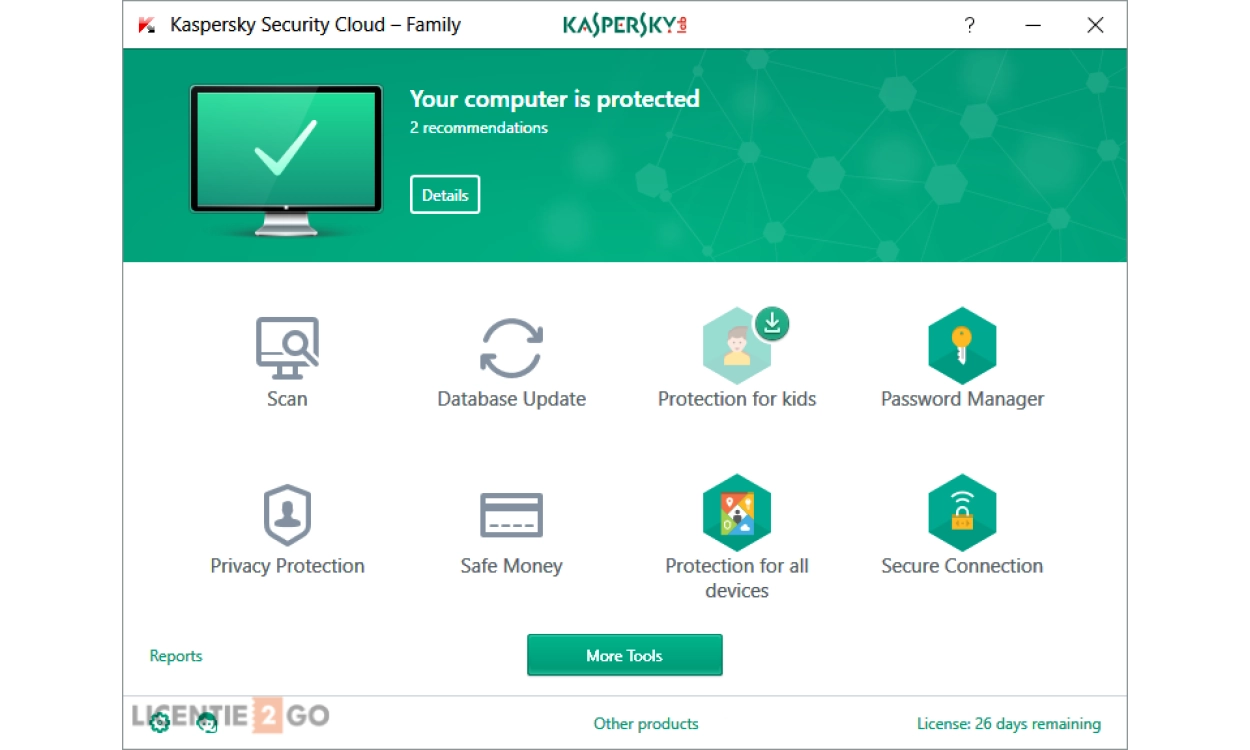 - Children - Protect your children with Kaspersky Safe Kids: The Internet can be a valueable resource of information for your children, mobile devices can contribe to this experience, and to stay in touch with your relatives. It is precisely in these endless possibilities that danger lurks. Kaspersky Safe Kids helps you create a safe and responsible environment for your children on your PC. Kaspersky Safe Kids offers settings for device useage, safe GPS zones, automated notifications of suspicious activities and, overviews of what your children look up, see and share online so that you are fully aware of the activities online and can protect them against any online dangers.