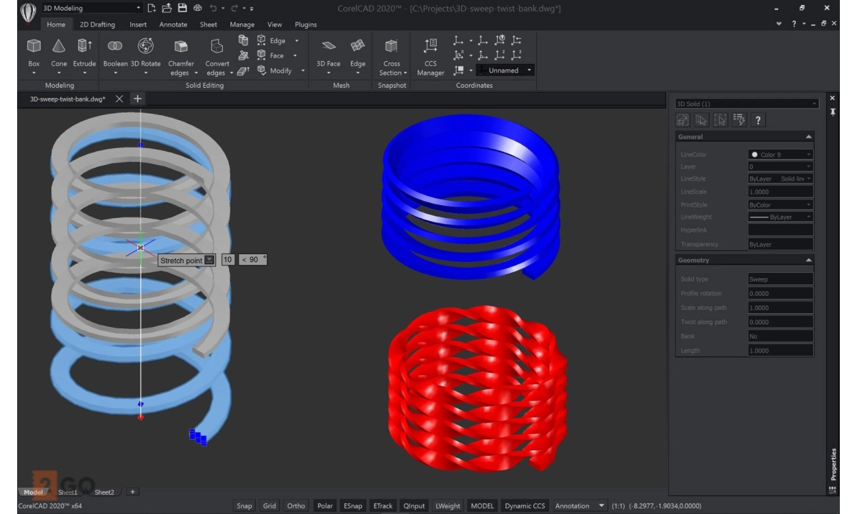 Transition from 2D to 3D: Create a 2D design in CorelCAD or import from CorelDRAW to switch to 3D. Extrude, rotate or swipe 2D entities along a path to move from 2D drawing to 3D modeling