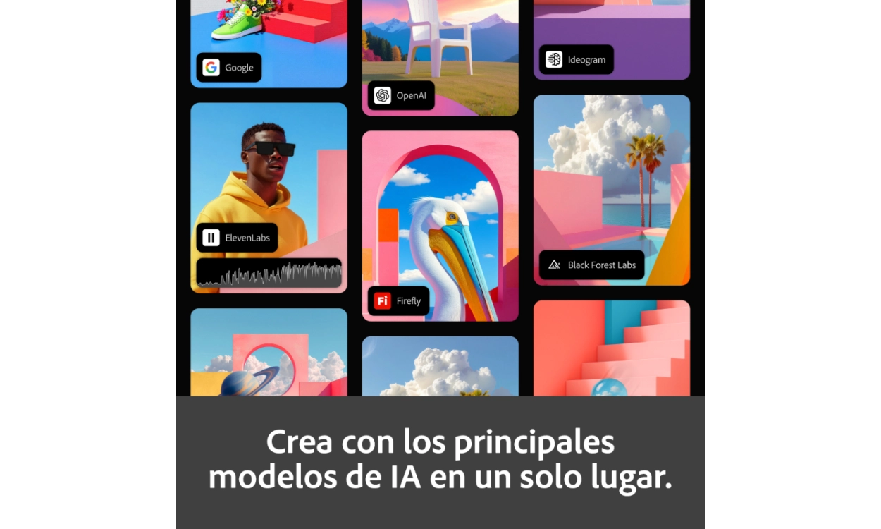 Adobe Firefly Standard funciona a través del navegador y también está disponible en dispositivos de escritorio y móviles. Esto te permite trabajar en diferentes momentos y lugares sin depender de un único dispositivo.
