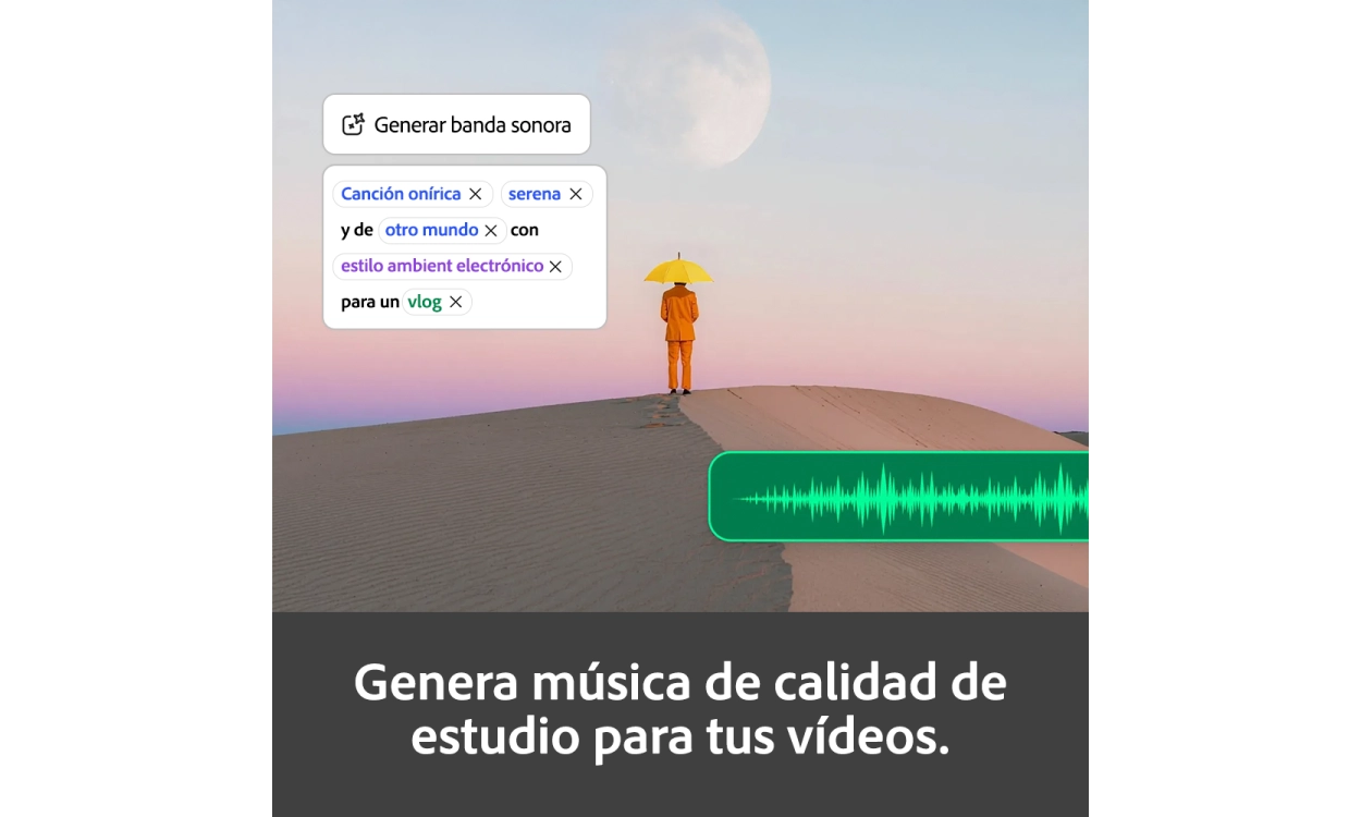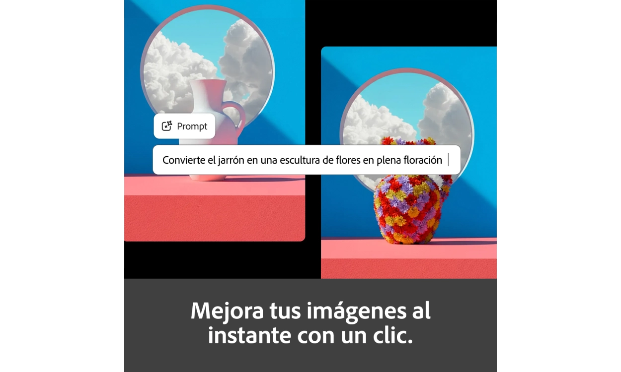Con funciones como Relleno Generativo, puedes agregar fácilmente nuevos elementos o eliminar partes de una imagen. Describes lo que deseas cambiar y el software lo procesa al instante. Esto te permite lograr resultados utilizables rápidamente, incluso sin un amplio conocimiento de diseño.