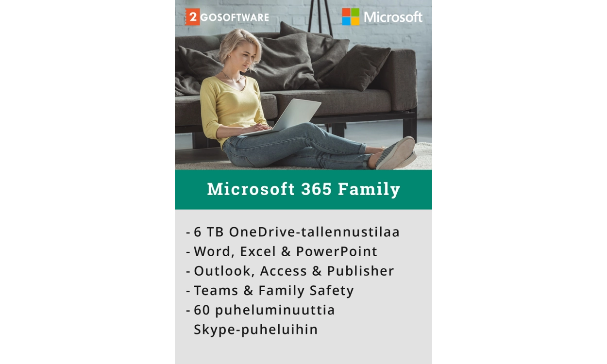 Microsoft 365 Family tarjoaa Word, Excel, Powerpoint ja Outlook yhdessä lisenssissä. Microsoft 365:llä saat myös OneDrive-tallennustilan, joten voit ottaa tiedostosi turvallisesti mukaasi kaikkialle. Saat vuositilauksen, joka sisältää myös oikeuden päivittää uusimpaan versioon. Kullekin käyttäjälle sallitaan 5 asennusta, joten tällä lisenssillä on käytettävissä 6x5 = 30 asennusta.
