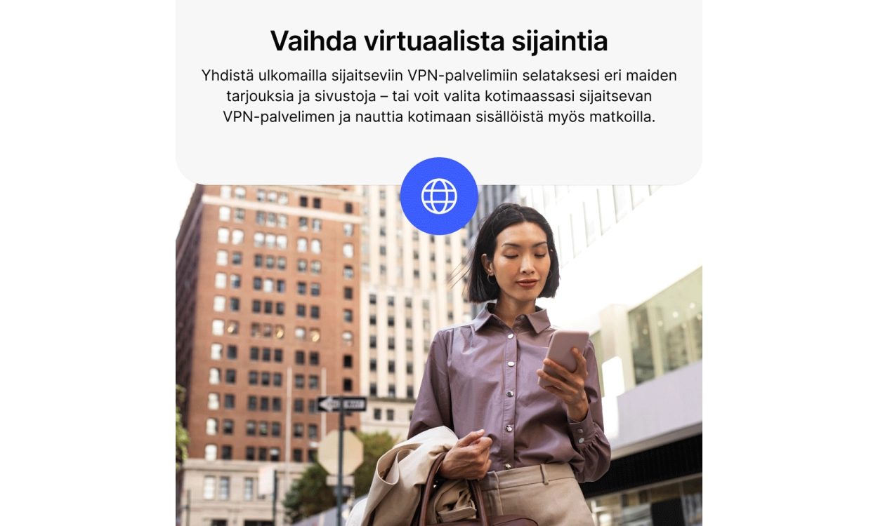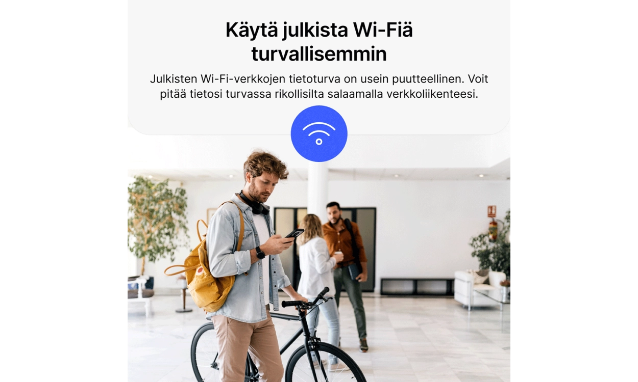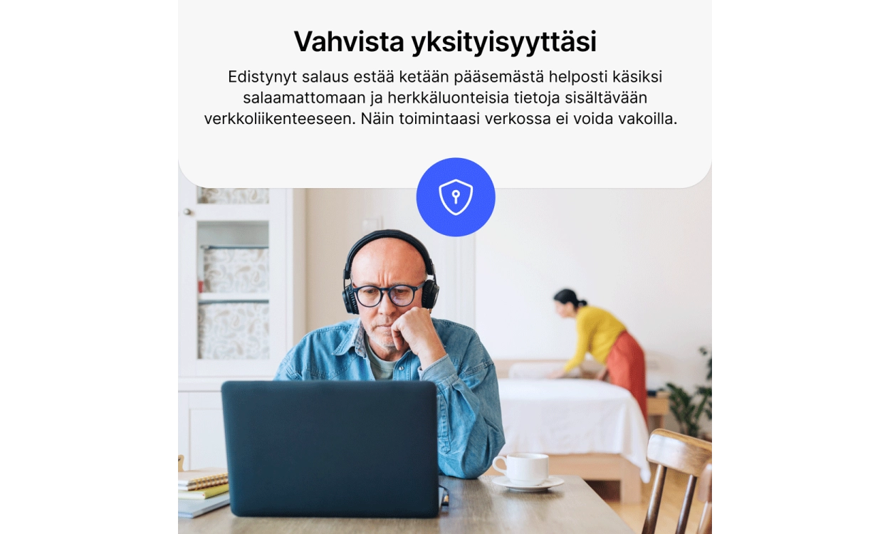 VPN tarkoittaa virtuaalista yksityisverkkoa. VPN-yhteys varmistaa, että internetliikenteesi ohjataan salatun tunnelin kautta, suojaten verkkotoimintasi uteliailta silmiltä. Tämä antaa sinulle enemmän yksityisyyttä ja turvallisuutta verkossa, samalla kun voit käyttää internetiä ilman rajoituksia.