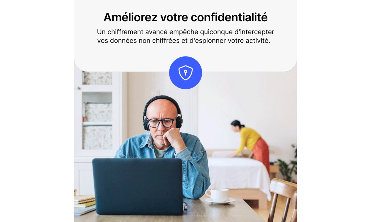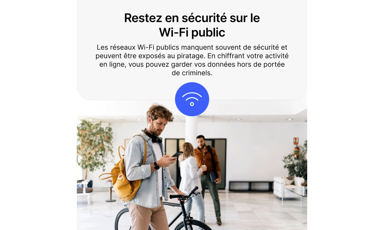 • Sécurisez votre connexion sur wifi : Les réseaux wifi publics peuvent être dangereux, mais NordVPN Basique crypte votre trafic internet, même sur des réseaux non sécurisés dans les cafés ou les aéroports, vous protégeant ainsi des hackers.