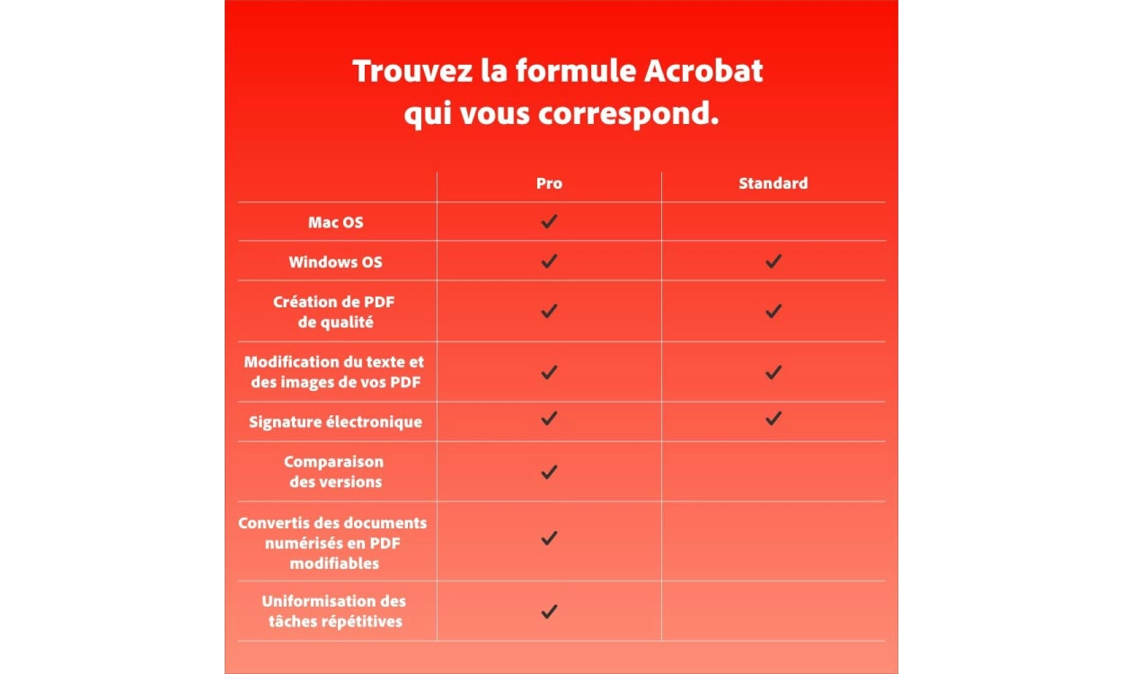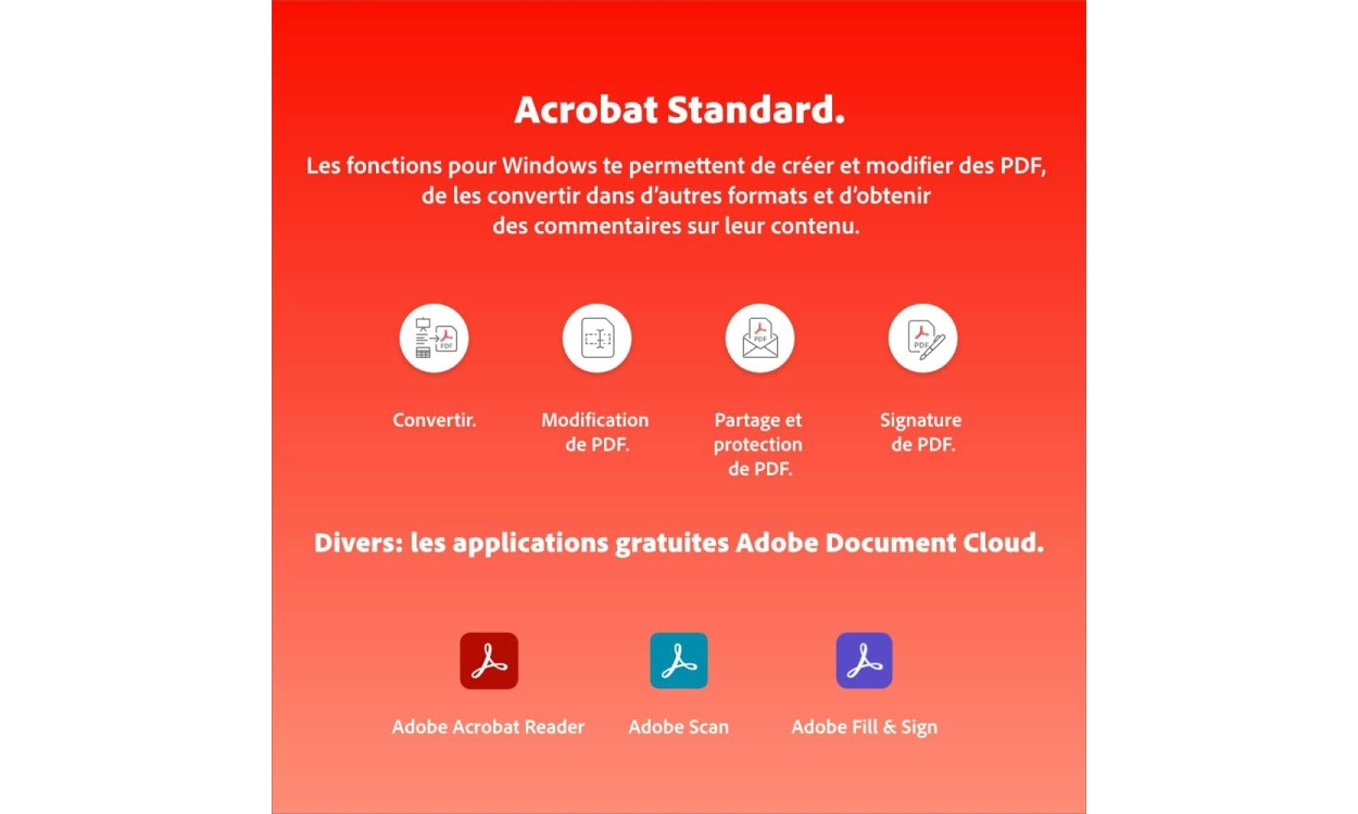 - Solution PDF tout-en-un : Modifiez, signez et sécurisez des PDF avec Adobe Acrobat Standard.