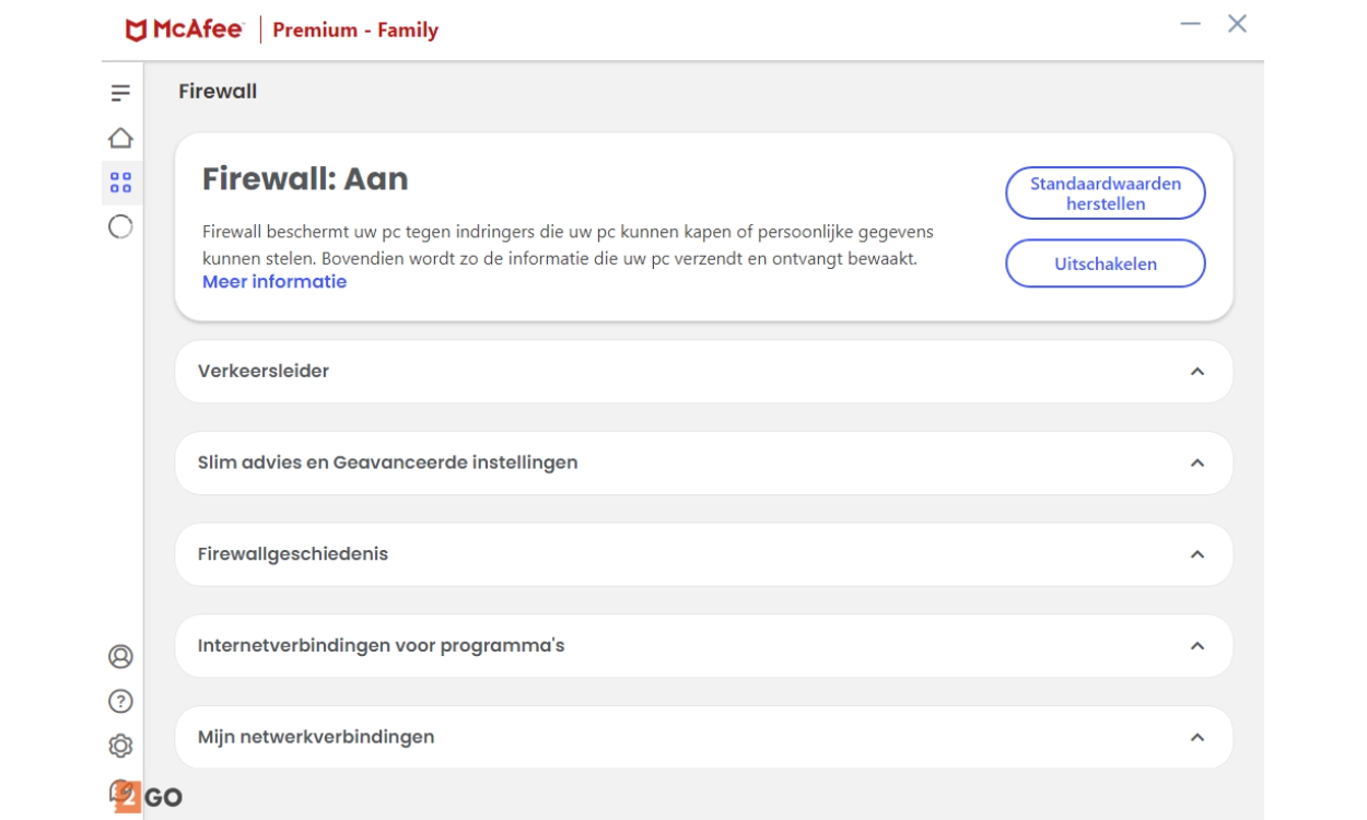 - Firewall: Beschermt je apparaten tegen indringers die je apparaat over kunnen nemen of persoonlijke gegevens kunnen stelen. Al het binnenkomende en uitgaande verkeer wordt gecontroleerd of het wel veilig is en geen verdachte data bevat.