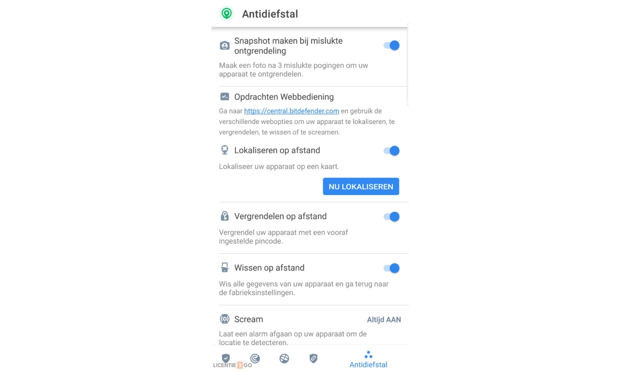 De Antidiefstalmodule heeft opties om van op afstand een Android-apparaat te lokaliseren, vergrendelen, wissen of er een bericht naar te sturen. Jouw telefoon maakt een foto van de persoon die in jouw afwezigheid met jouw telefoon probeert te knoeien en verstuurt deze naar Bitdefender Central.