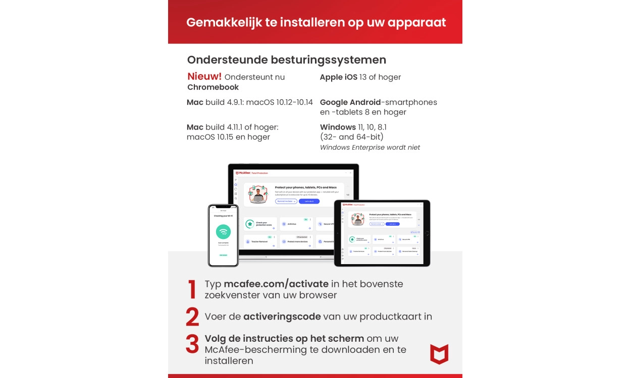 Windows computers worden beveiligd tegen virussen, malware en andere ongewenste programma's. Op jouw smartphone of tablet biedt McAfee gegevensbeveiliging en antidiefstal-functies, ook jouw WiFi-verbinding wordt extra beveiligd. Identiteitsbeheer slaat jouw informatie beveiligd op zodat je jezelf snel kunt aanmelden bij websites. Daarnaast biedt McAfee Internet Security versleuteling van bestanden op jouw Windows-computer.