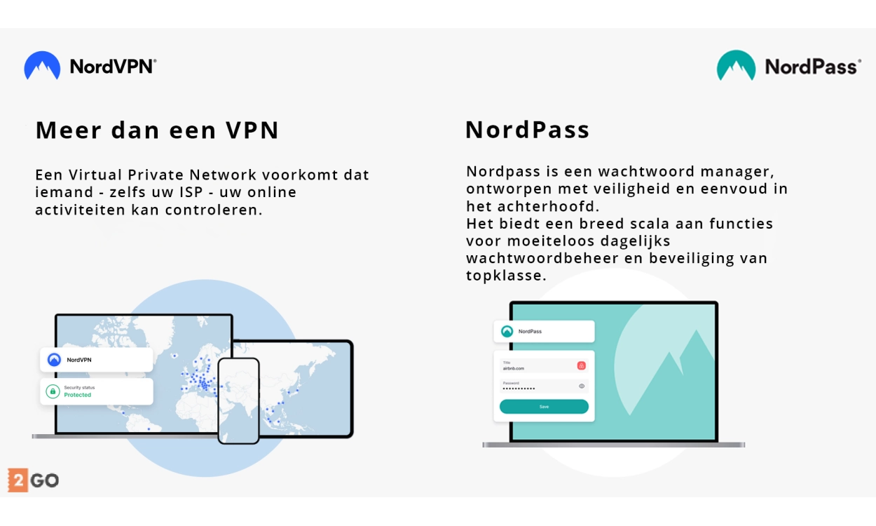 Door het gebruik van andere IP-adressen kun je toegang krijgen tot websites en online diensten die anders niet gebruikt konden worden doordat deze anders geblokkeerd zouden zijn. NordVPN kan worden geïnstalleerd op al jouw Windows, Mac, Linux en smartphone apparaten. Er zijn zelfs versleutelde proxy-extensies beschikbaar voor Chrome en Firefox. Daarnaast kun je met één enkel NordVPN account maar liefst 10 apparaten beveiligen! Kopen via 2GO Software betekent 100% legitieme software inclusief installatiegarantie, een handleiding die jou stap voor stap helpt met downloaden, installeren en activeren en een team van specialisten die je graag verder helpt, wanneer je er alsnog niet uitkomt!
