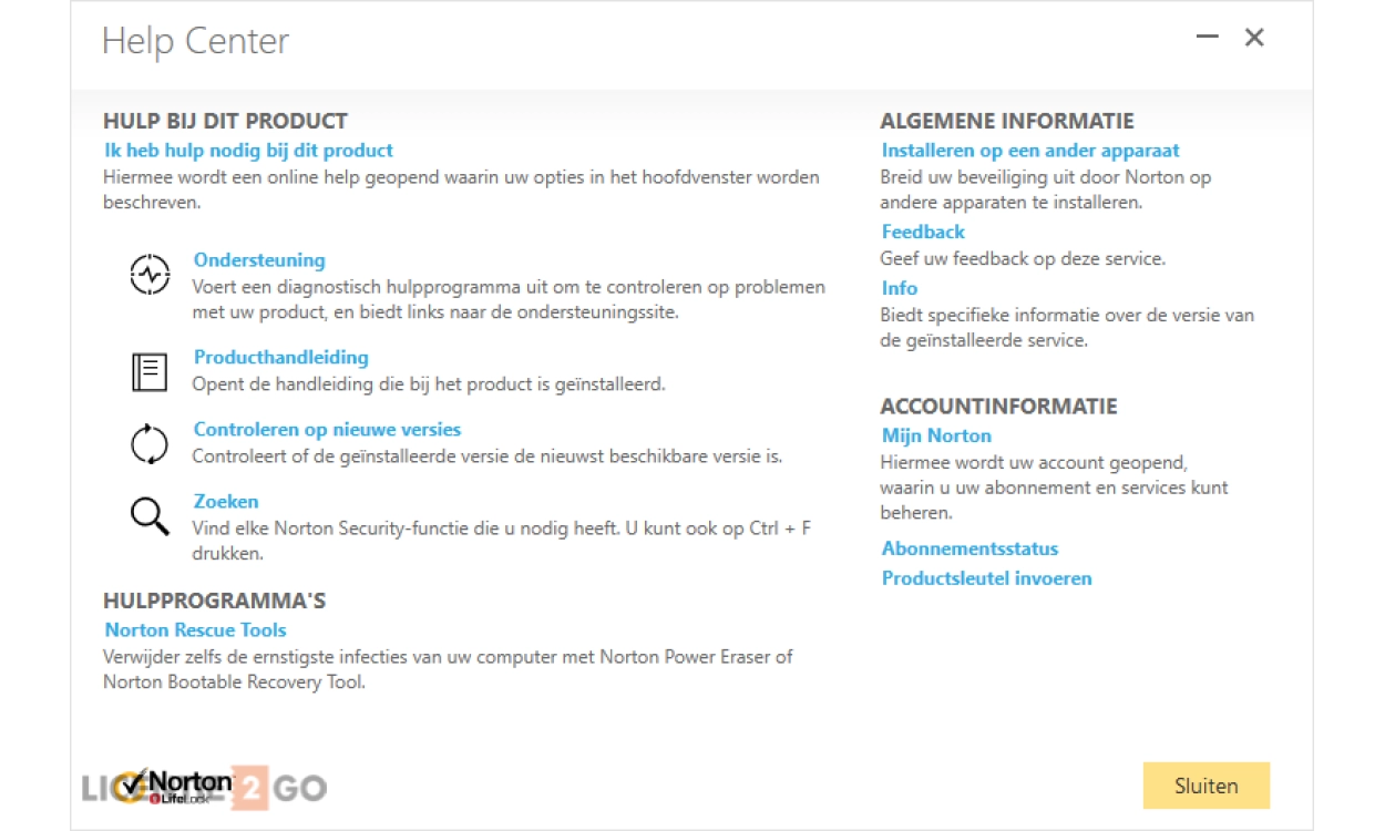 Dit pakket is te gebruiken als eerste installatie of als Norton verlenging. Gaat het om een eerste installatie en gebruikt u op dit moment een ander beveiligingsproduct? Dan helpen we u bij 2GO Software stap voor stap met de overstap. We zorgen ervoor dat u geen moment onbeschermd blijft. Voor uw Norton verlenging zorgen we altijd voor een soepele overgang met instructies voor verlengen zonder verlies van lopende abonnementsdagen.